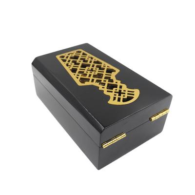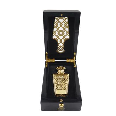 Премиальное решение для упаковки роскошных парфюмерий с элегантными золотыми штампами и полой резьбой на высококачественных черных деревянных лакированных коробках.