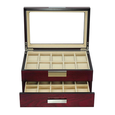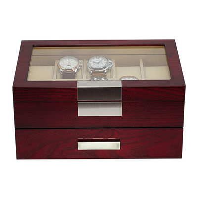 This high-end wooden watch box combines elegant design with practical storage functionality, featuring a glossy red finish and clear acrylic window for display purposes.