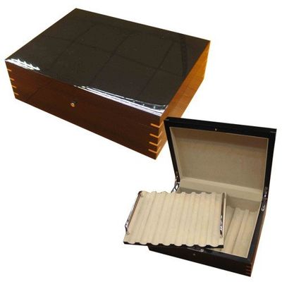 Custom lacquered wood gift pen box featuring carved logo and velvet-lined interior slots. Available in high-gloss or matte finishes with complete personalization options.