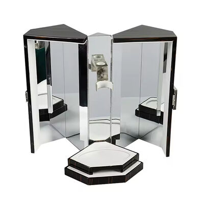4.Mirror installation seamless integration: The mirror surface inside the box is made using invisible adhesive cold bonding + frame pressing technology. This not only prevents the mirror surface from fogging or falling off, but also enables a seamless connection between the mirror surface and the box (the gap is less than 0.1mm), ensuring the luxurious and durable appearance of the display, and meeting the strict requirements of the French market for wooden box detail craftsmanship.